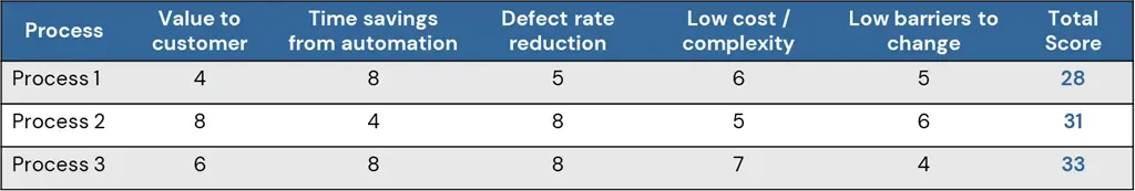 Six Sigma is a methodology for process improvement, and its principles are highly relevant to process automation. Six Sigma approaches the above questions in its Define phase, with tools that include the Project Selection Matrix or Project Viability Model.²