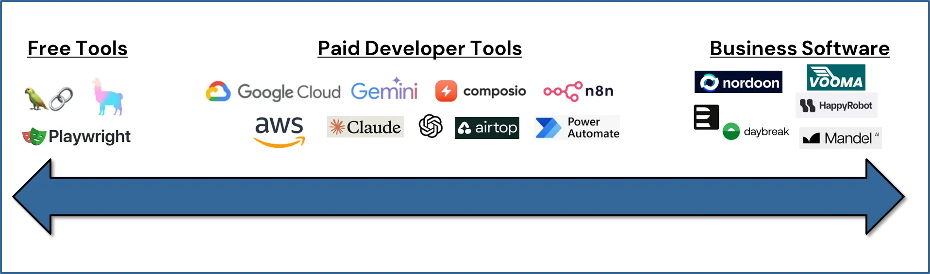 On the left-hand side, we go in the direction of programming languages, but in our diagram we cut it off at existing open-source, free packages to emphasize that we will likely use these. On the right-hand side, we see fully developed business software solutions, and here we emphasize some of the new players focused on supply chain automation. However, longer established players could go here as well.